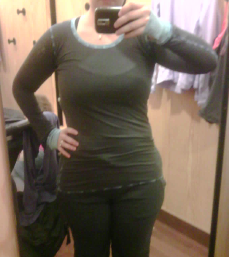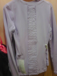 So this is the very lovely Run: Dash LS in Lavender (or was it Lilac..). This is the Size 10 which felt large in the chest and upper body/arms but because it’s a form fitting running luon I was in no mood to see what the 8 did to my belly. See pictures bellow for why. When/If I get this I’ll probably go for the size 8 but motivate myself to tighten things up a bit. I LOVED this top and loved the ruffles. It’s basically a really great warm LS shirt you can wear out and about, under a vest or jacket and it just doesn’t look like an athletic top save for the little reflective detailing at the outer wrist which is quite subtle. I would love to get this top in a different color though which is why in the end I left without it. I do like the Lilac but I have an Inspire Pullover in Lilac and I need something a little bit different. They had Black and Teal as well but those weren’t tempting me today.